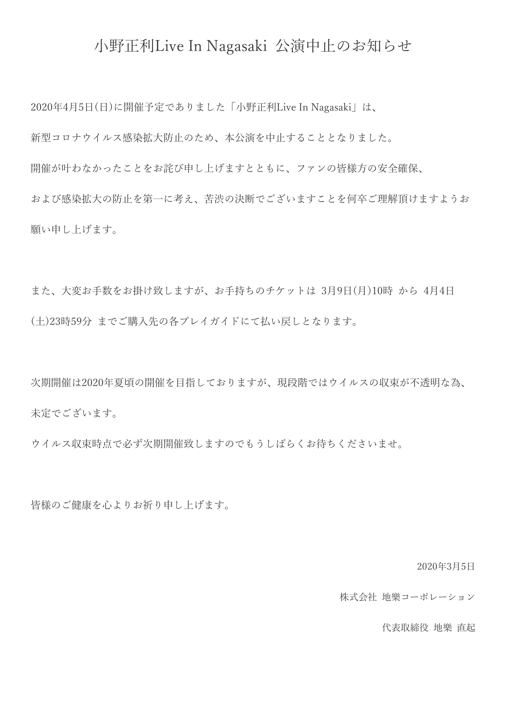 NEWS ALL ライブ イベント メディア リリース その他 2020.03.05 その他 ⼩野正利Live In Nagasaki 公演中⽌のお知らせ 2019.03.01 その他 ライブDVD『Now and…』がONO’S SHOPにて販売開始!! 2017.11.24 その他 小野正利、新アーティスト写真公開! < 1 2
